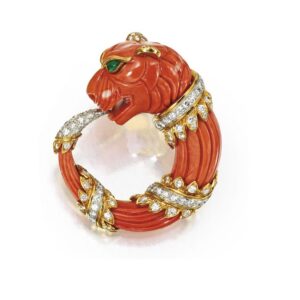 DAVID WEBB 18K YELLOW GOLD EMERALD AND DIAMOND CORAL LION BROOCH